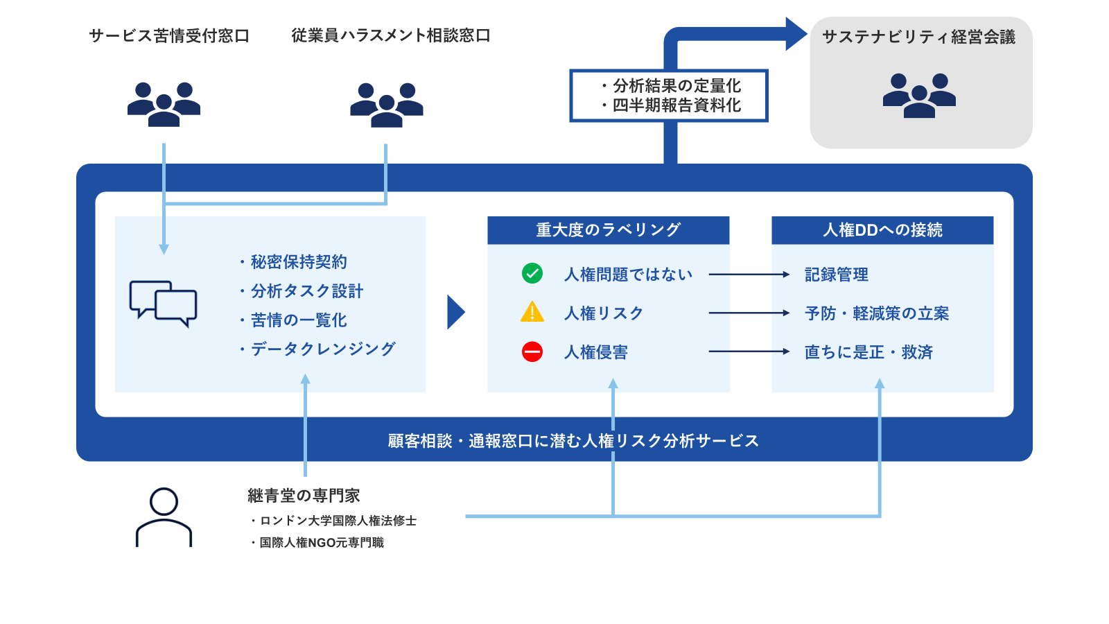 継青堂は、人権に関する高度な専門性とネットワーク、そしてプライム上場企業への豊富な支援実績を活かし、貴社の従業員や顧客の声を拾い上げ、社会的信頼を守るための仕組み構築を支援します。